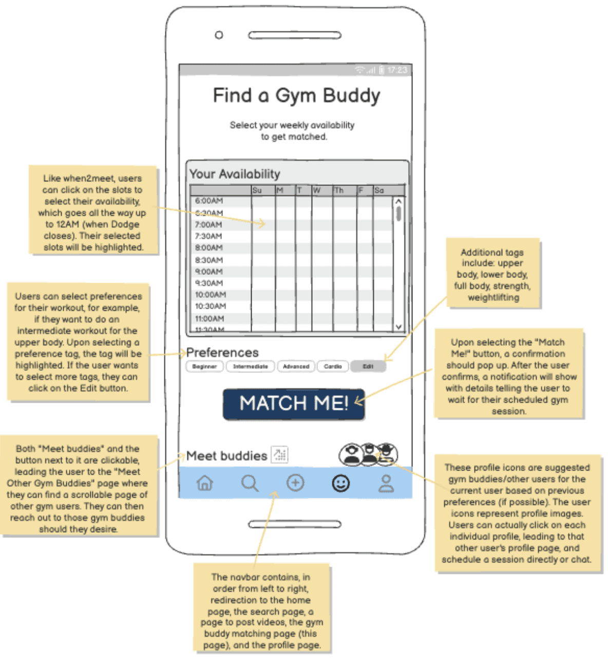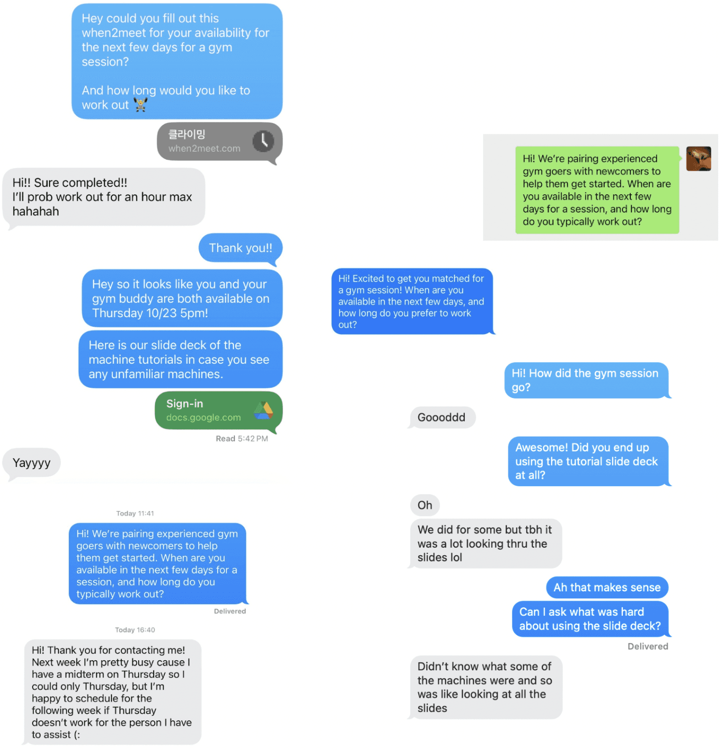 To validate our concept, we conducted smoke-and-mirrors prototyping by acting as the "schedulers." We asked students to fill out their availability using when2meet, then manually matched pairs and texted them gym session times. We also sent them a slide deck with photos of Dodge machines paired with tutorial videos.