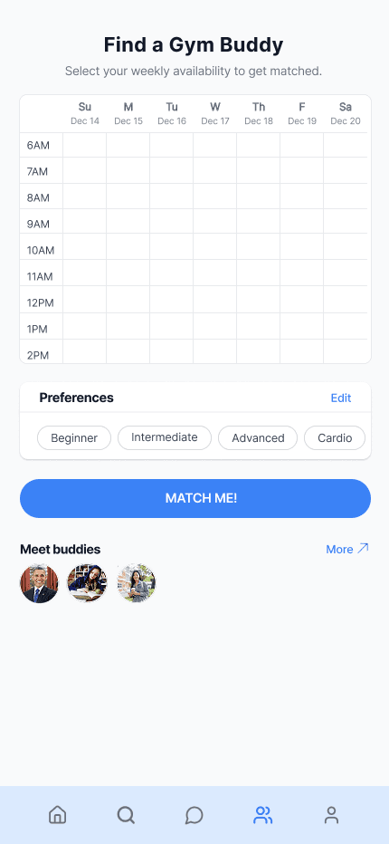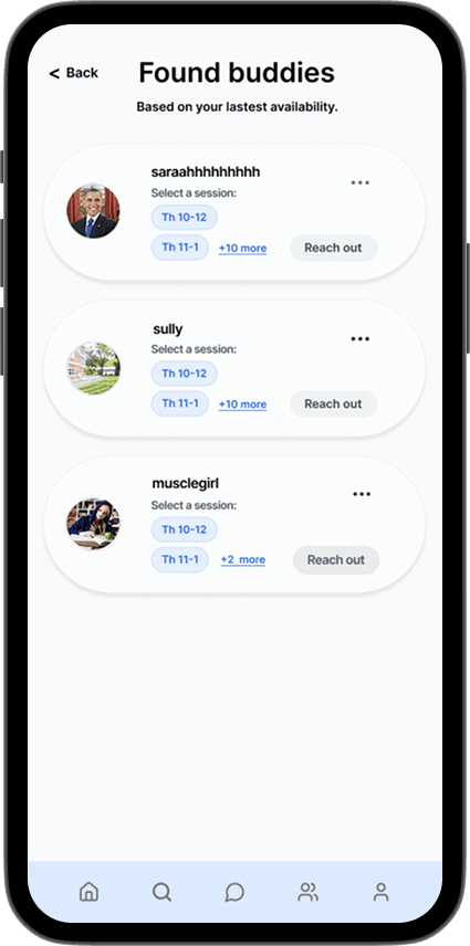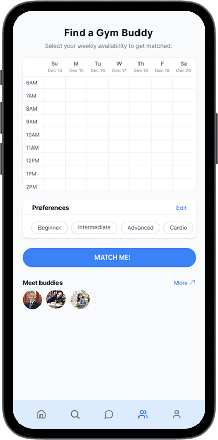 Finding a gym buddy shouldn't be complicated. We made matching effortless so students can find people to work out with quickly and easily.
