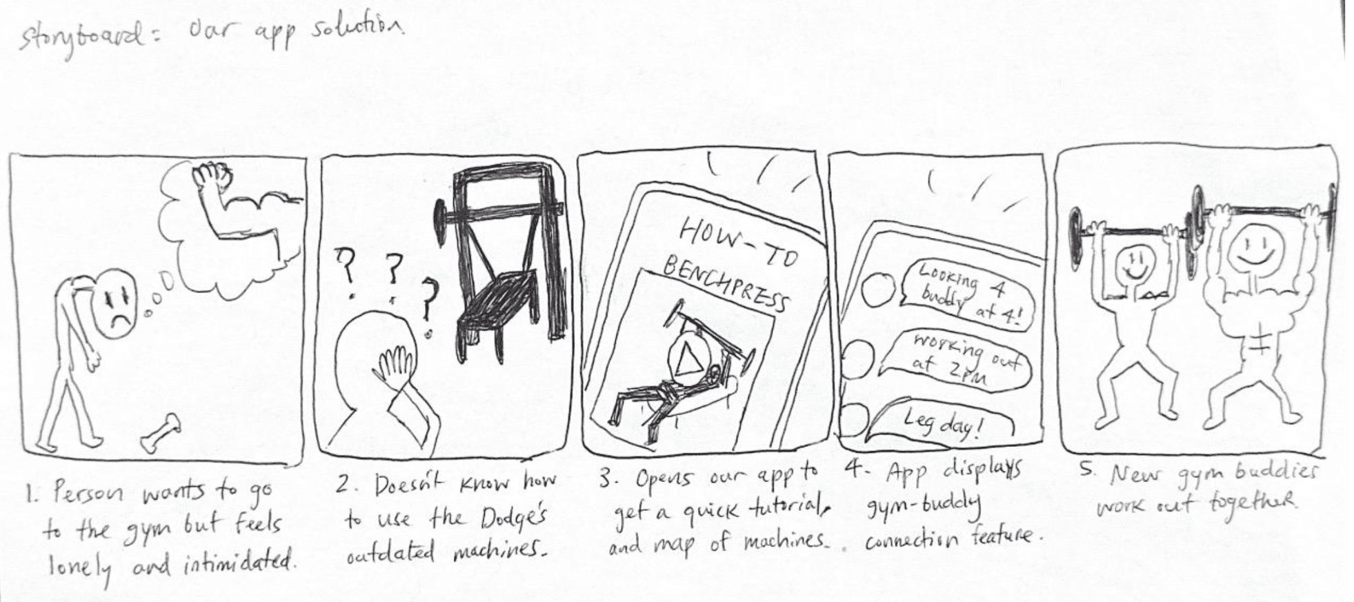 With a clear understanding of the problem and user journey, we explored four different design approaches to solve gym intimidation and social isolation. Each storyboard represents a different "design hill"—distinct solutions to our problem.