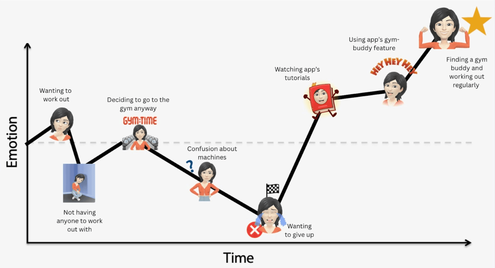 To understand the full user experience, we mapped out a student's emotional journey from wanting to work out to actually building a consistent habit. This visualization shows the critical pain points where students lose motivation and the moments where our solution can help turn things around.