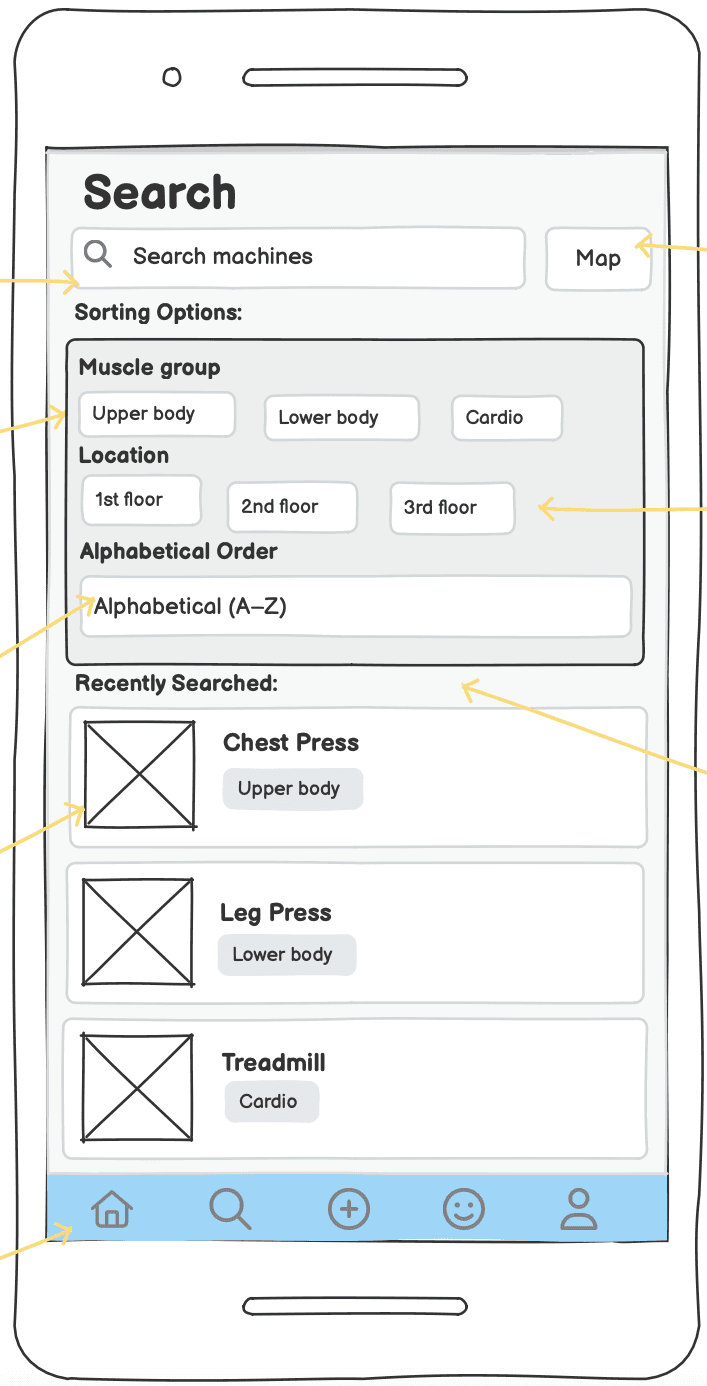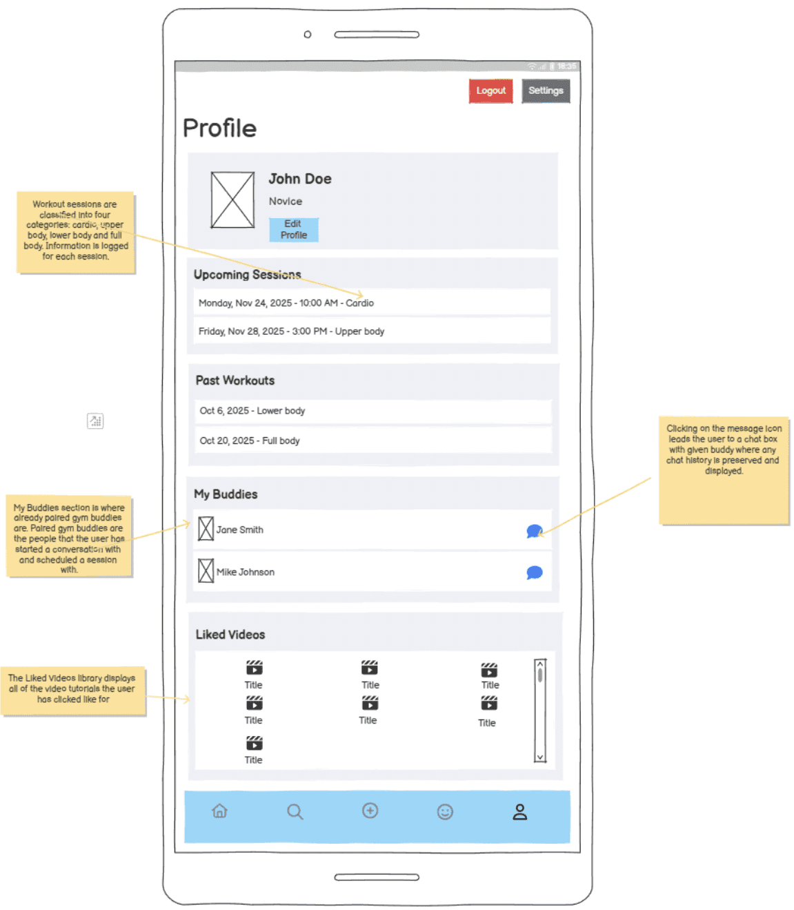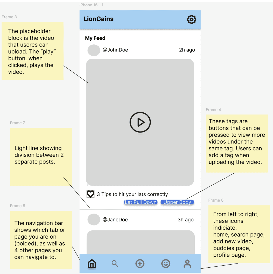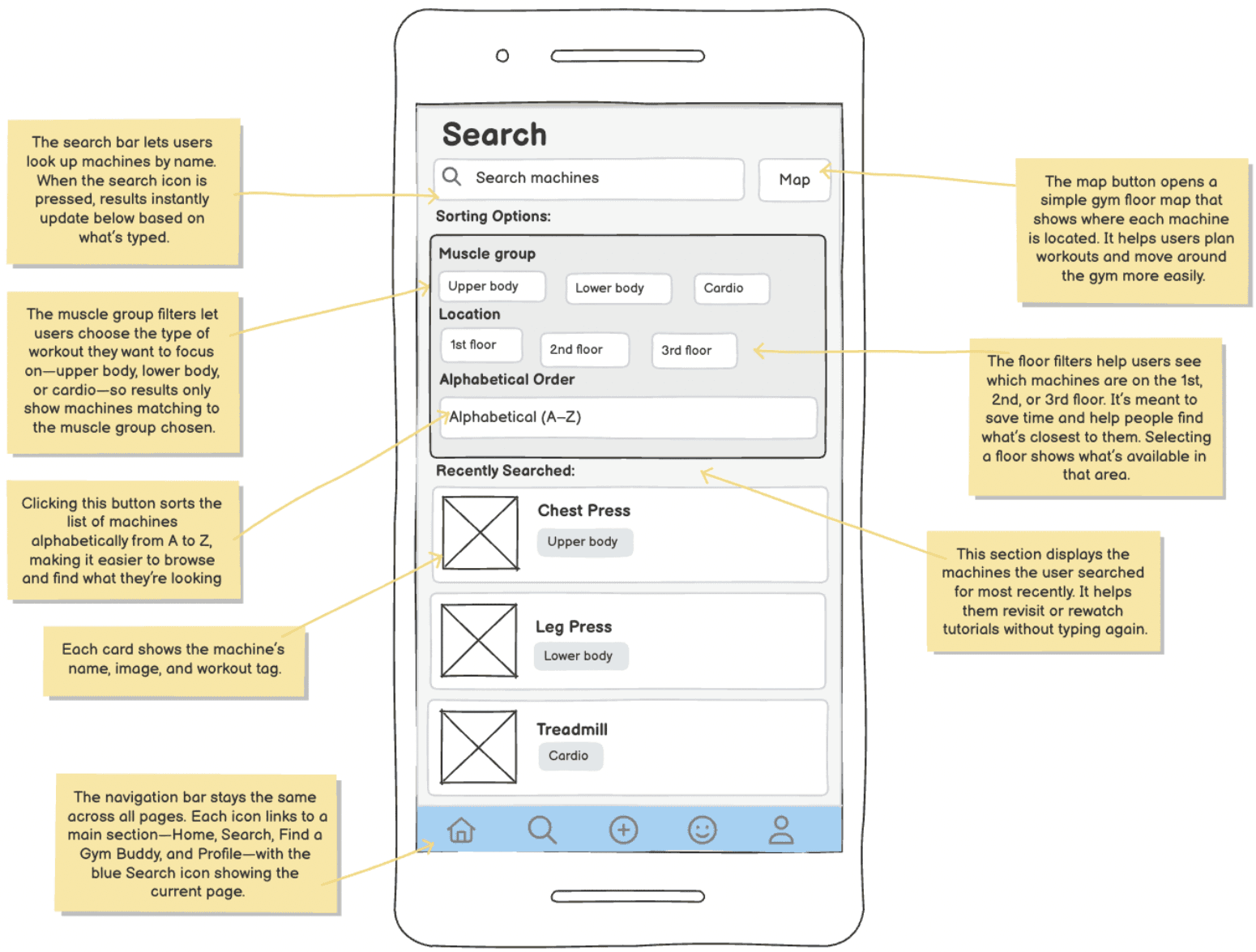 Based on this feedback, we designed four key low-fi prototype screens (Search, Profile, Find a Gym Buddy, and My Feed). For each screen, we made detailed notes of every feature, ranked visual cues by importance, and carefully considered information hierarchy to ensure our design was efficient and functional. This process helped us prioritize what matters most to users and eliminate unnecessary elements.