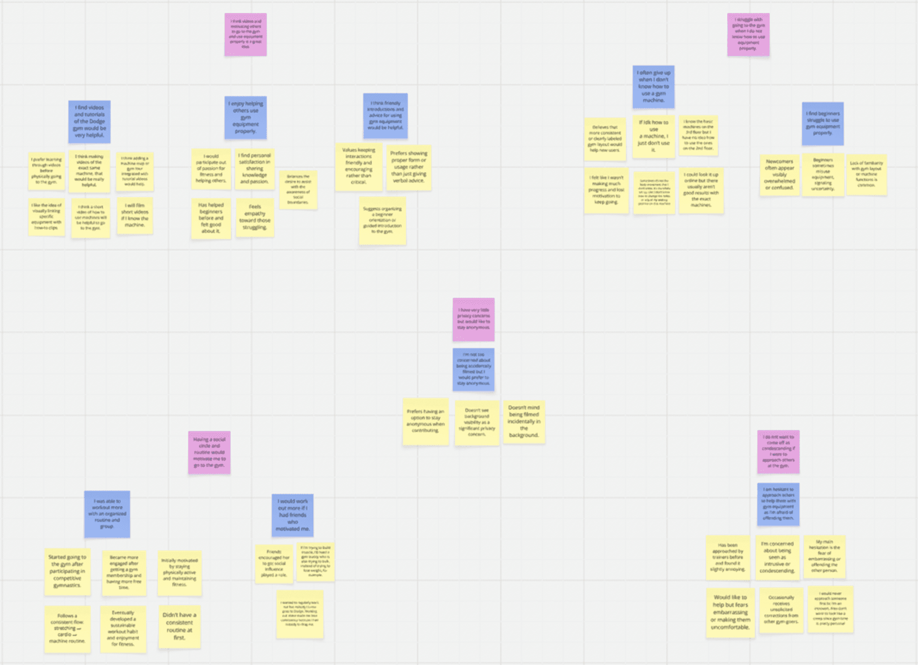 To synthesize our research findings, we interviewed 10 additional students—5 regular gym-goers and 5 non-gym users—and organized their responses into an affinity diagram. This helped us identify patterns and common themes across both groups.