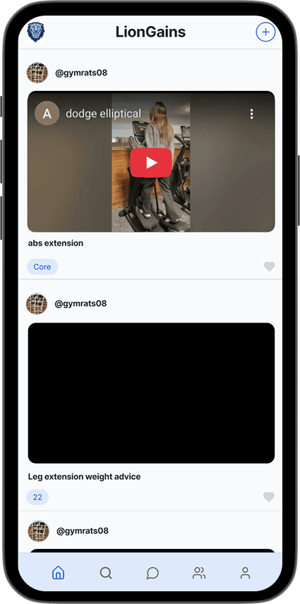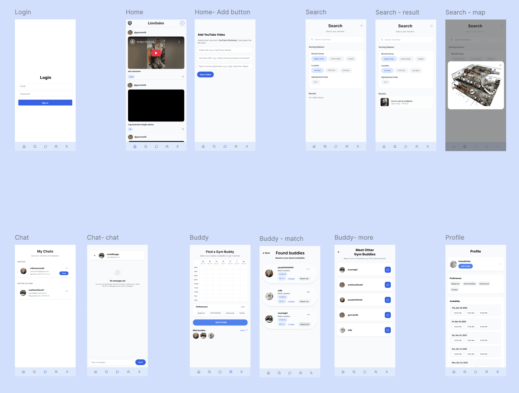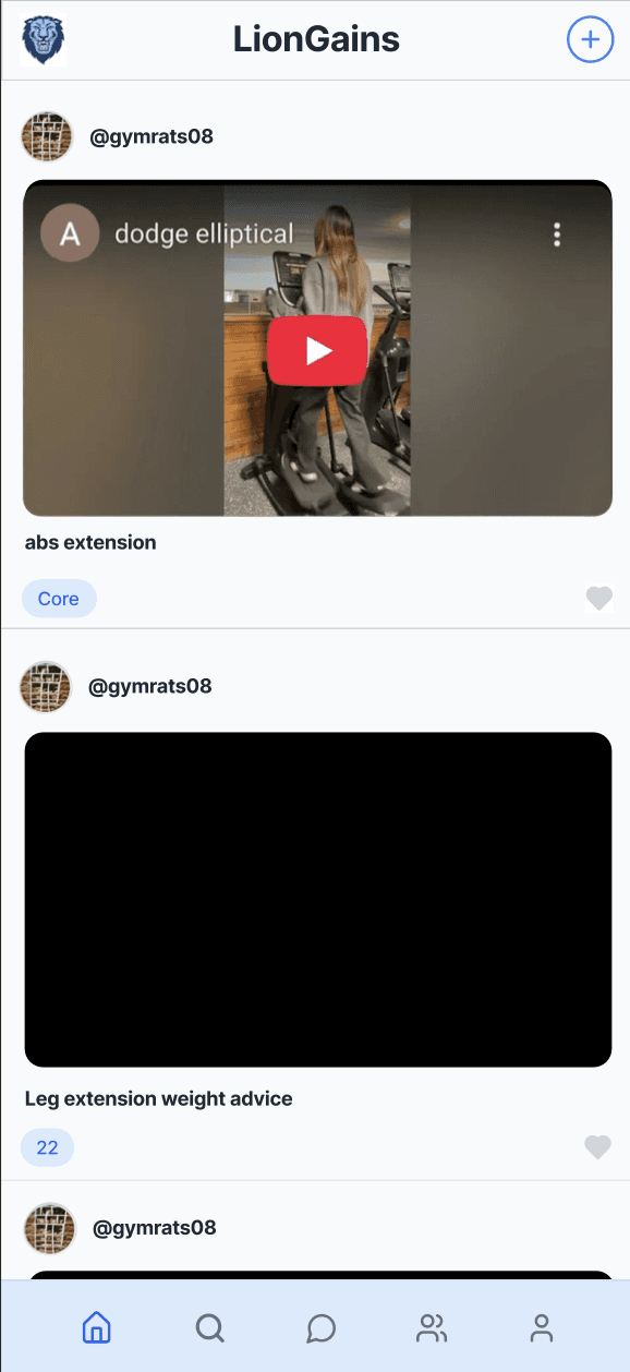 LionGains is a fully functional mobile app that brings our design solution to life. Users can match with gym buddies based on availability and fitness goals, discover peer-uploaded workout tutorials, and build a consistent workout routine with community support.